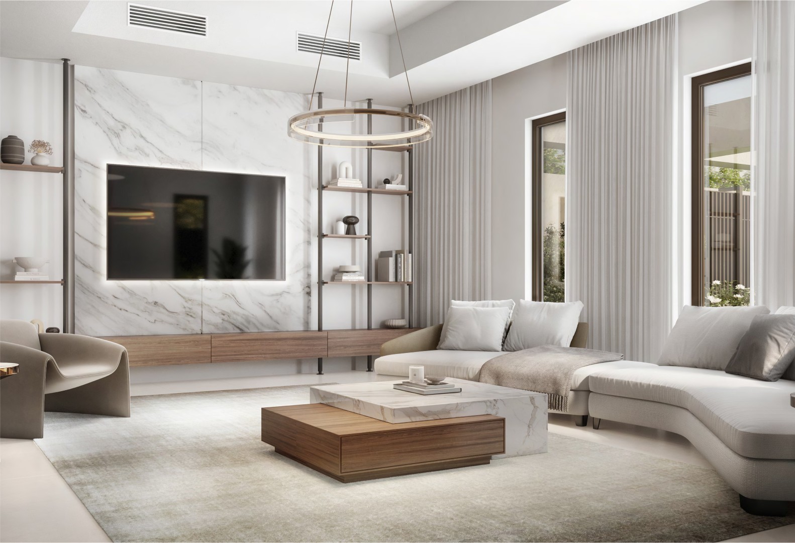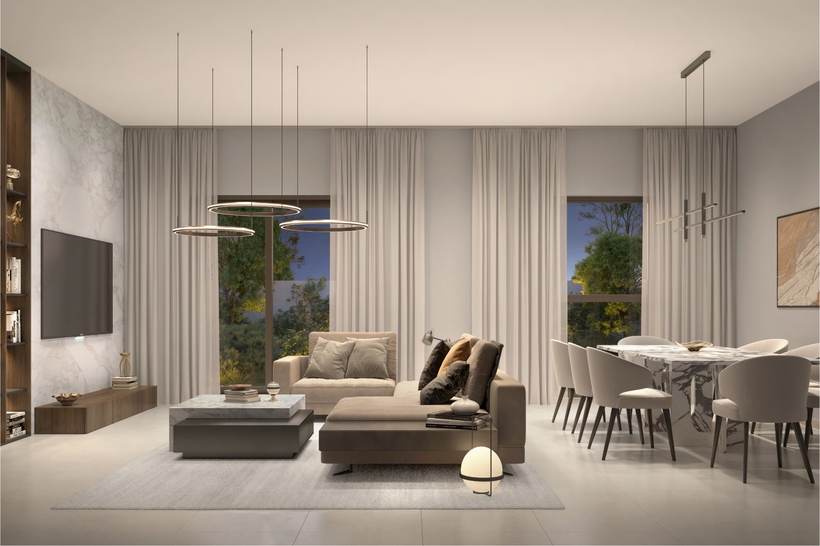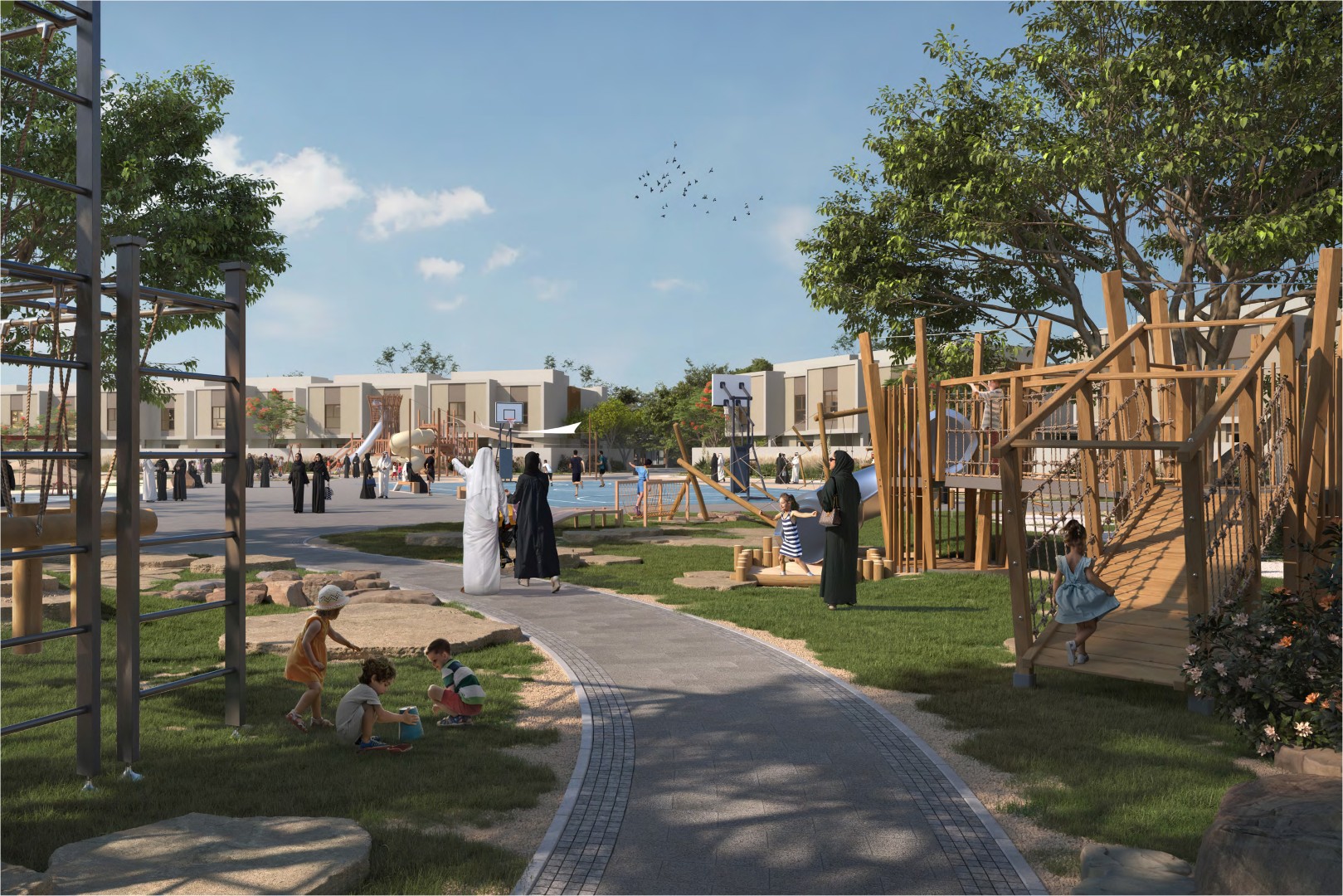 تشتمل الهندسة المعمارية الحديثة على شرفات مظللة وأسقف عالية الانعكاس للحفاظ على برودة المنازل. وفي الداخل، ينصب التركيز على الإضاءة الطبيعية والتخزين الواسع والتصاميم الفعالة، مع مطابخ عائلية مفتوحة على حدائق خاصة. يمكن للمشترين تخصيص منازلهم من خلال خيارات الدار العقارية.