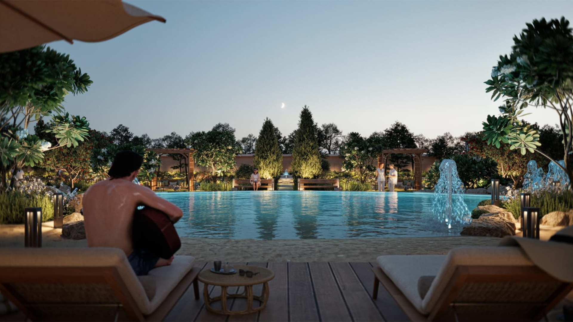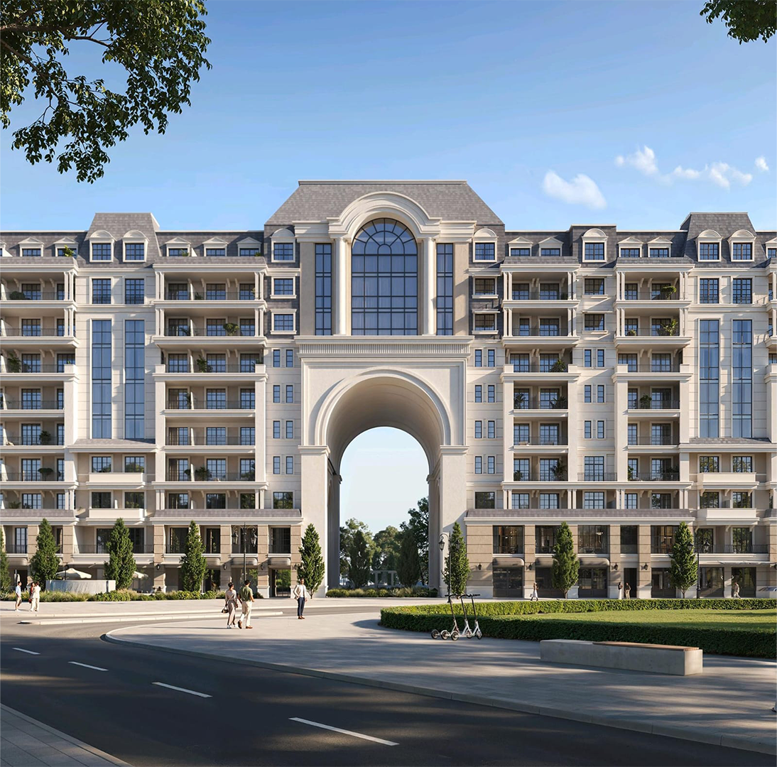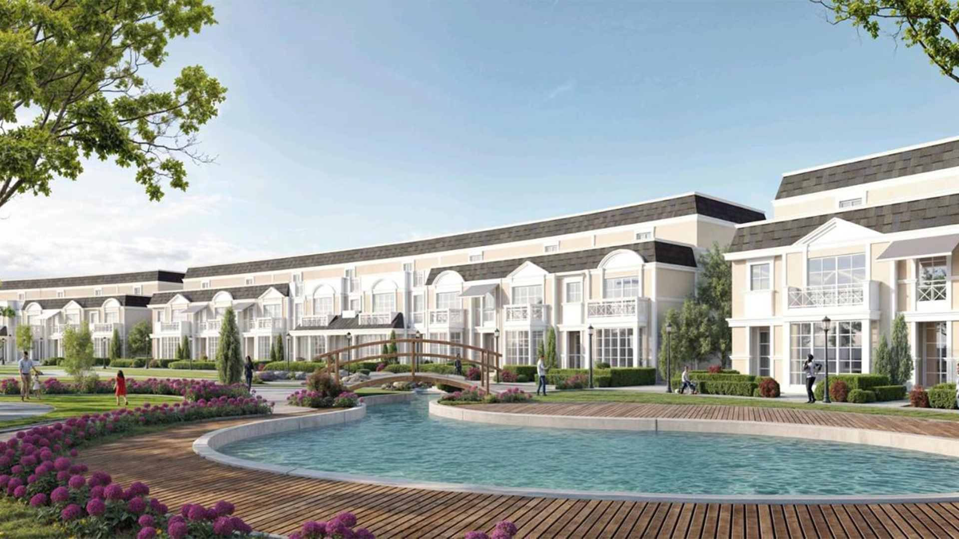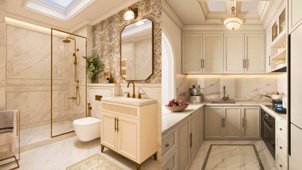 Architecture takes a soft European cue with gentle colors, elegant lines, and generous glazing. Courtyards and landscaped edges ease the buildings into their setting, while shaded terraces open to water and green views. Inside, fully furnished homes feature semi-closed kitchens with branded appliances. Each residence includes a private 3×3 m garden, and interiors pair marble floors with warm timber accents, built-in wardrobes, and premium sanitary ware for a timeless finish.