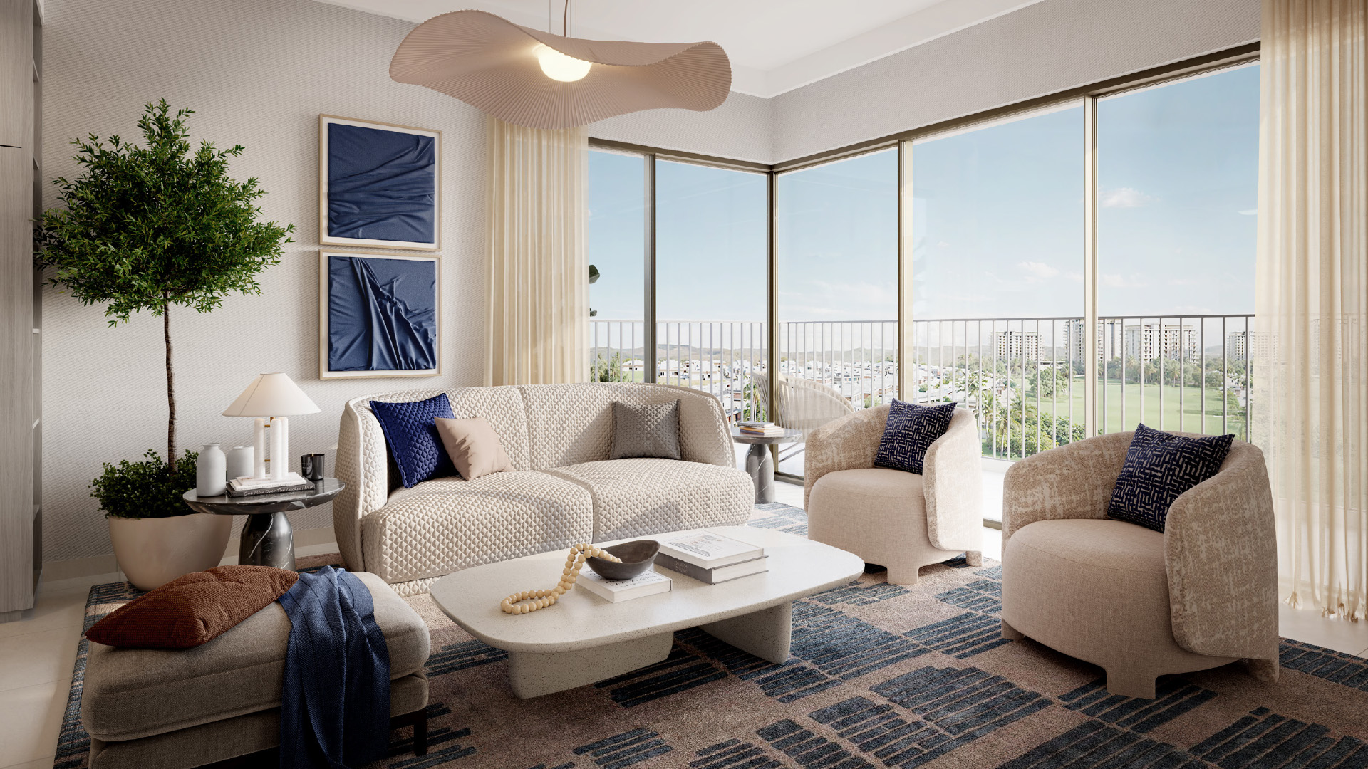 The project features a curated collection of 1, 2, and 3-bedroom apartments designed with a balance of modern elegance and timeless comfort. Interiors are finished in earthy tones and natural materials, with rich wood finishes, stone accents, and soft colour palettes that create a warm, relaxing atmosphere. Expansive glazing frames sweeping green vistas, allowing light and nature to become part of daily life. Sizes range from approximately 797 sq ft up to 1,778 sq ft, making the homes ideal for both end-users and long-term investors.