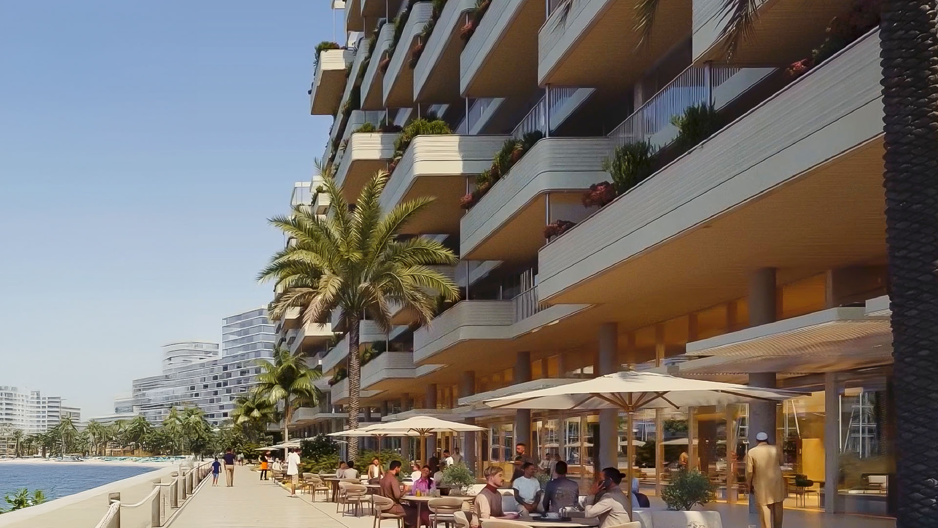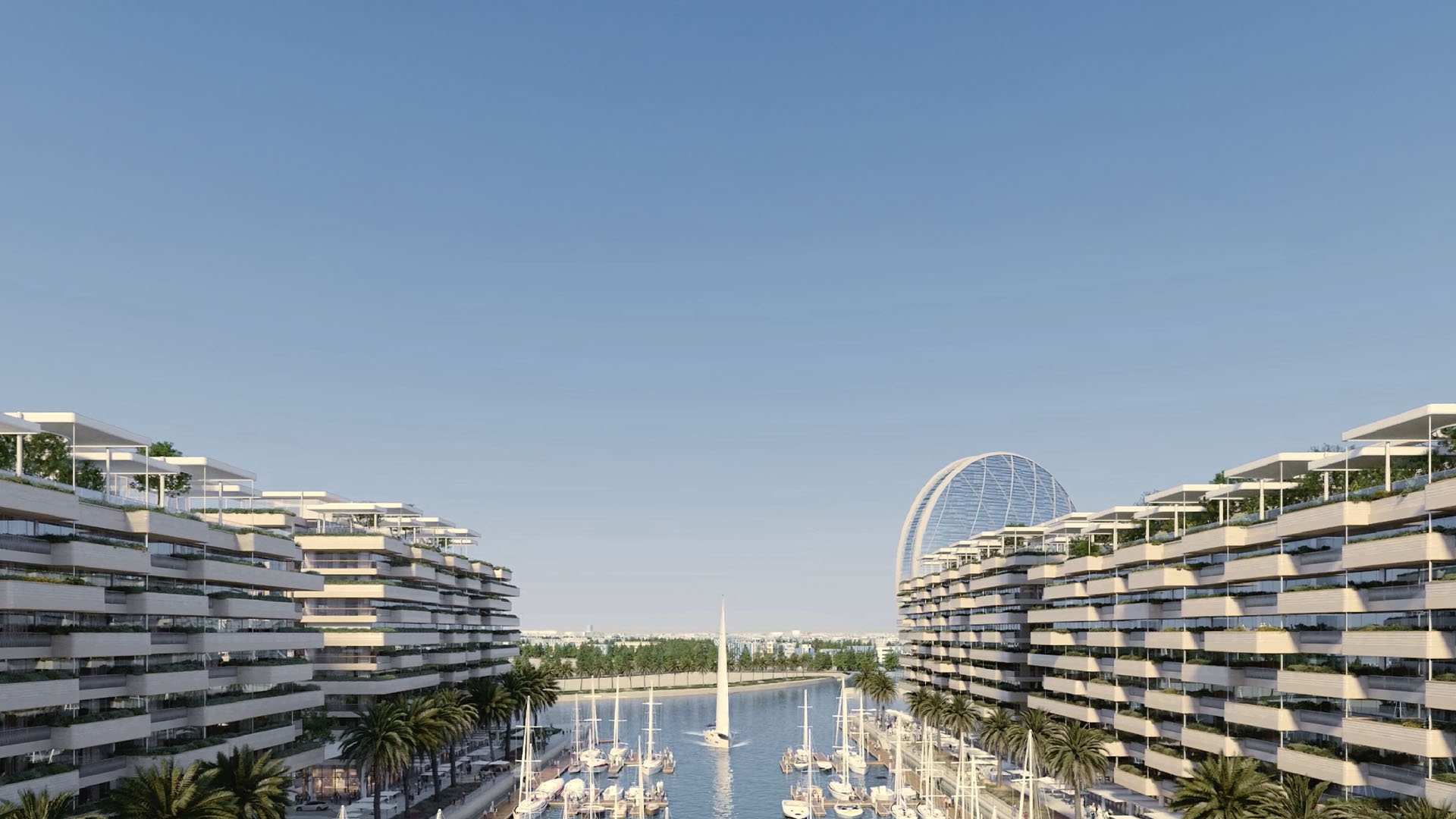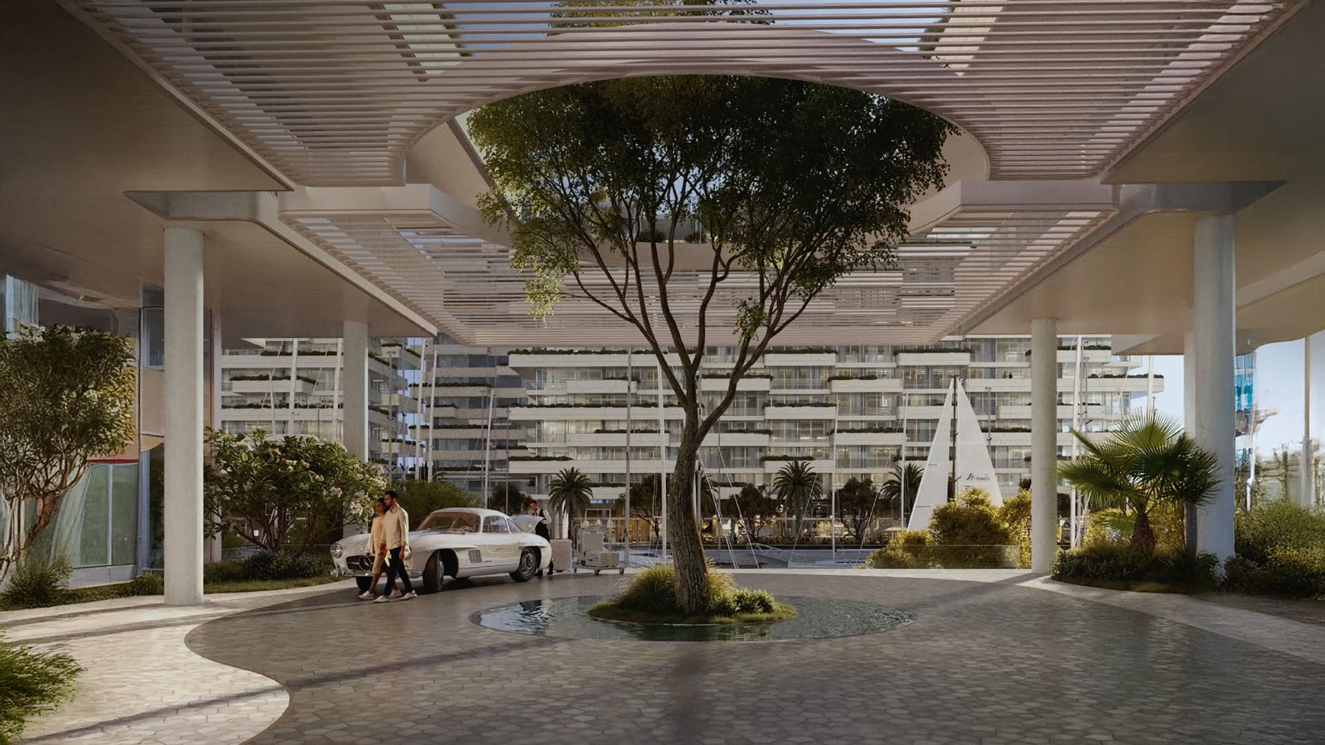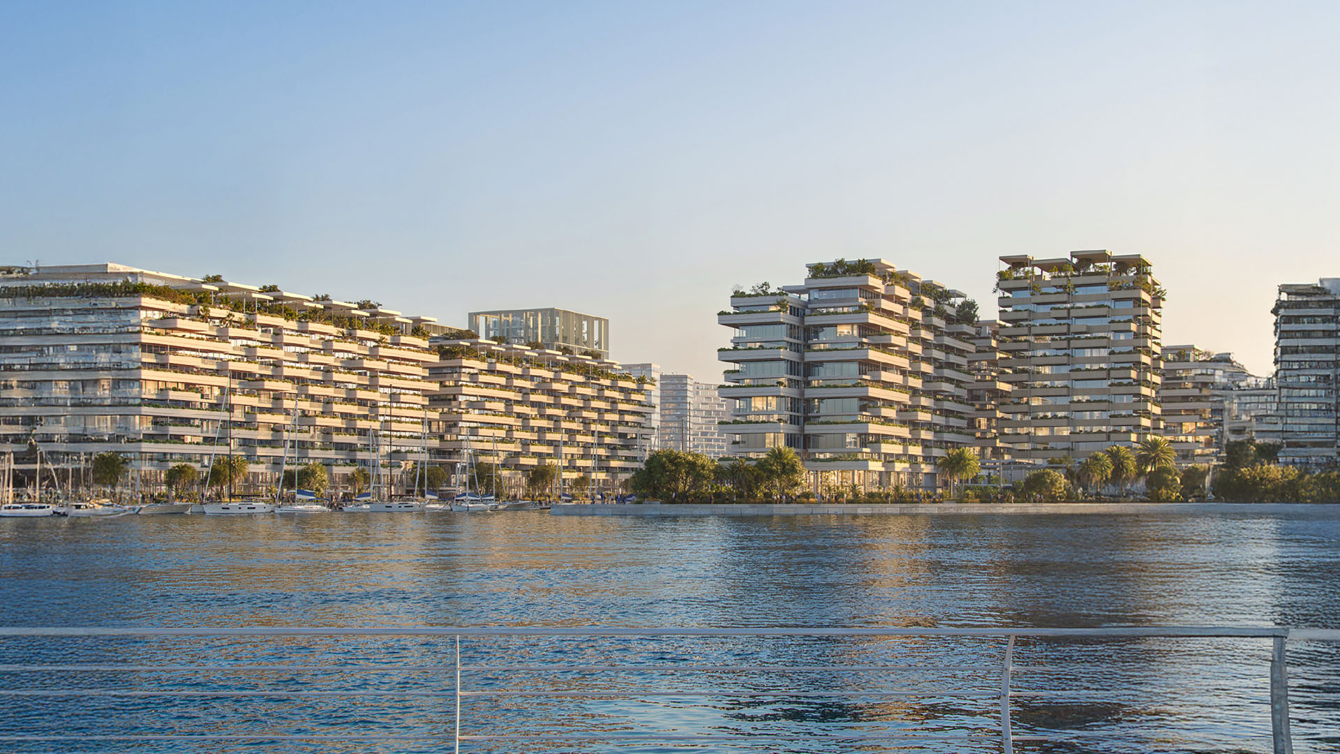 The design emphasizes light, water, and greenery. Buildings are oriented to frame views of the marina and skyline, featuring large glass panels and shaded terraces. Planted edges and water features help soften the microclimate and enhance the public space. The overall result is a modern waterfront aesthetic that remains practical for the sun and heat of Abu Dhabi.