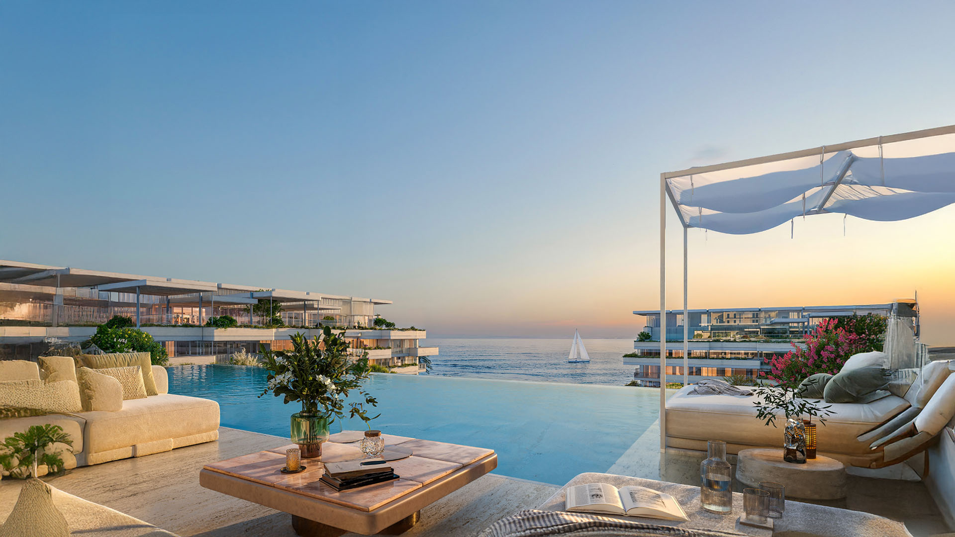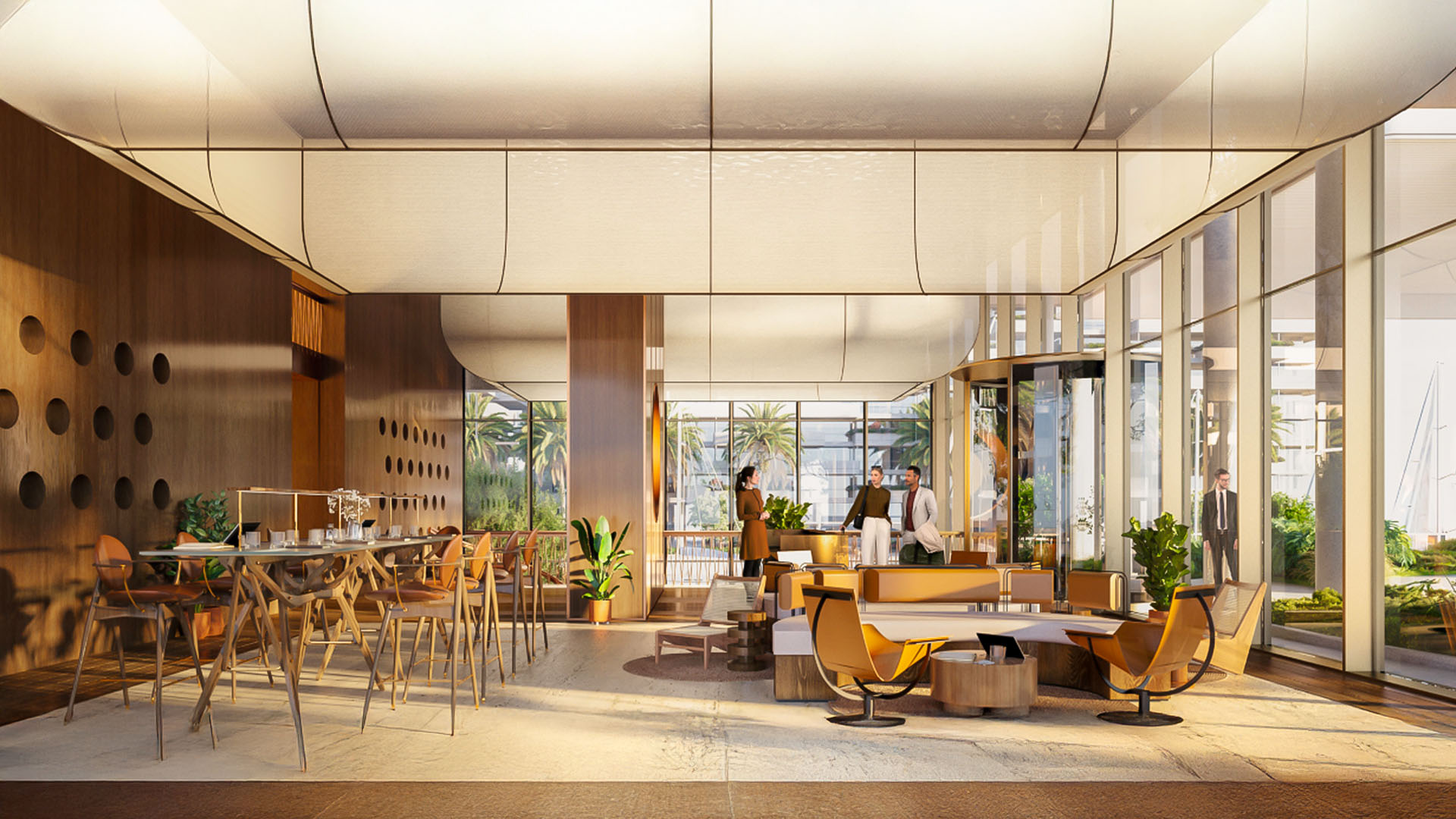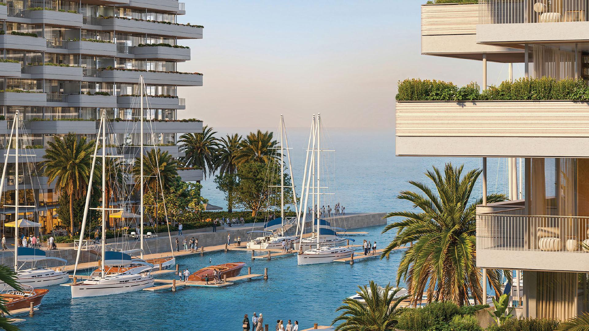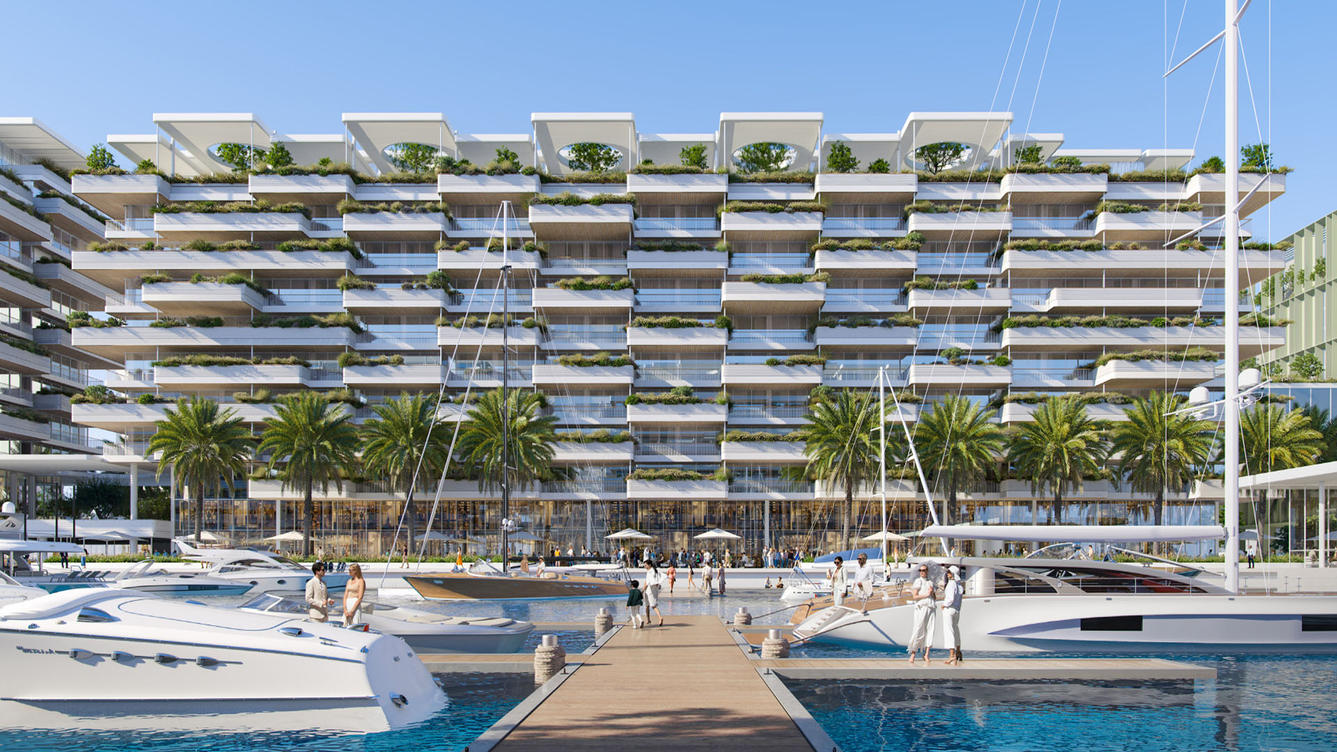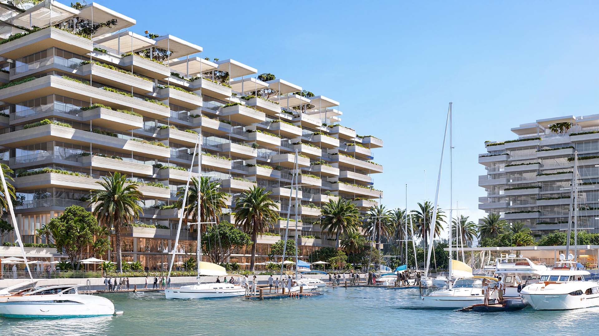 The design emphasizes light, water, and greenery. Buildings are oriented to frame views of the marina and skyline, featuring large glass panels and shaded terraces. Planted edges and water features help soften the microclimate and enhance the public space. The overall result is a modern waterfront aesthetic that remains practical for the sun and heat of Abu Dhabi.