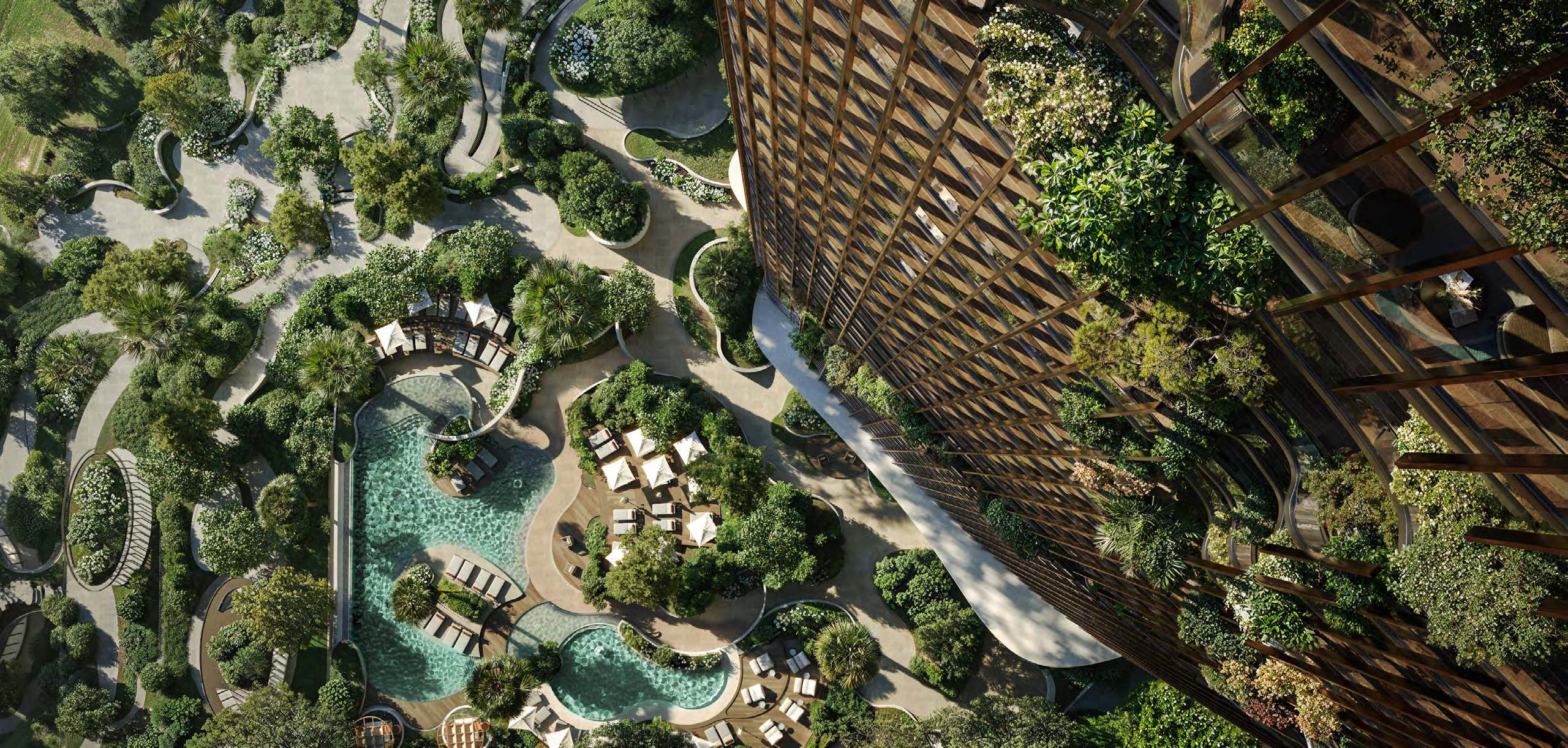 Communal areas are woven seamlessly into the architecture. Landscaped podium terraces, shared pavilions, and forest-facing pools create places to gather or retreat as the day unfolds. Spaces for children, work, fitness, and relaxation are thoughtfully positioned to support daily life without overwhelming it