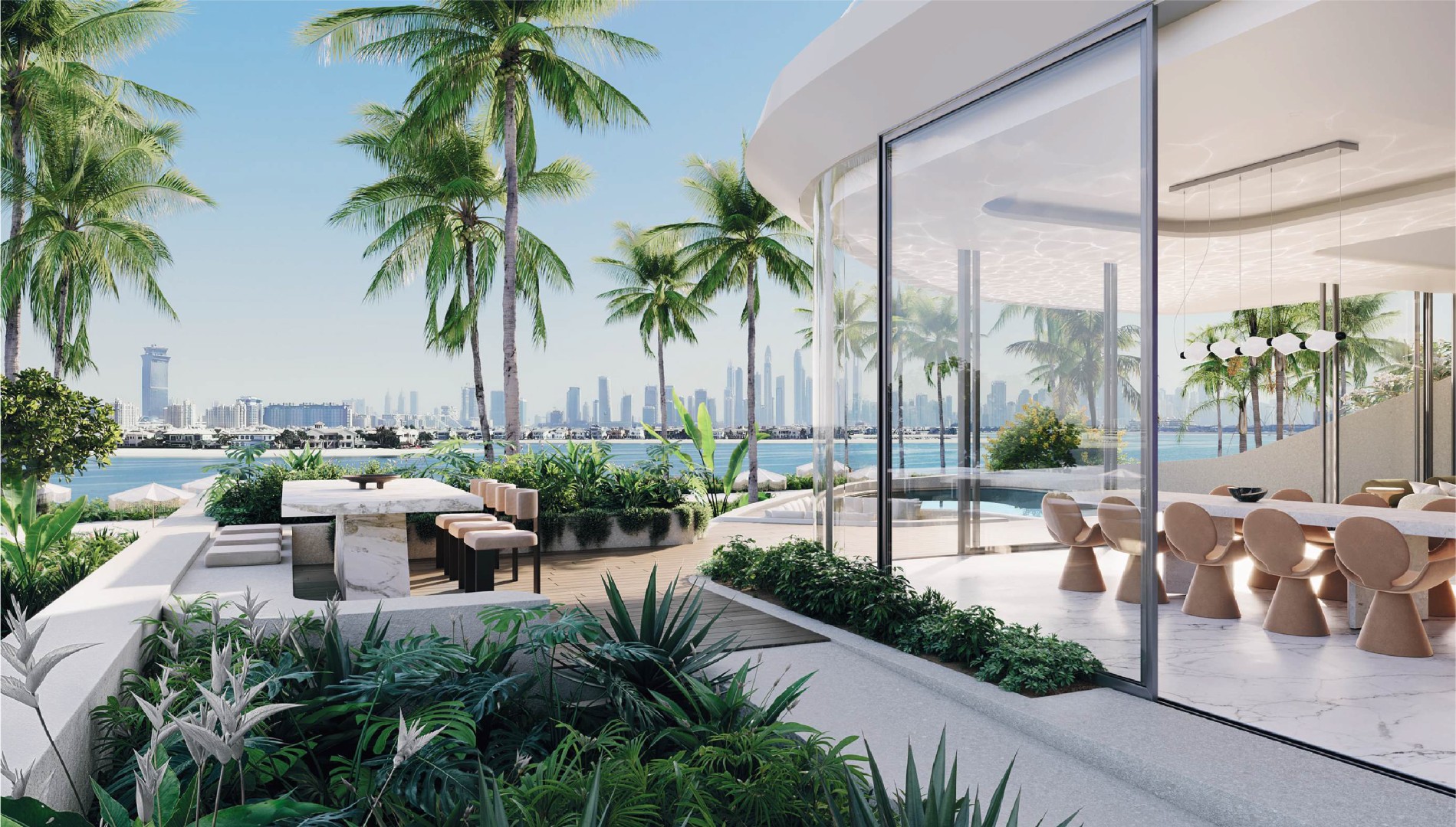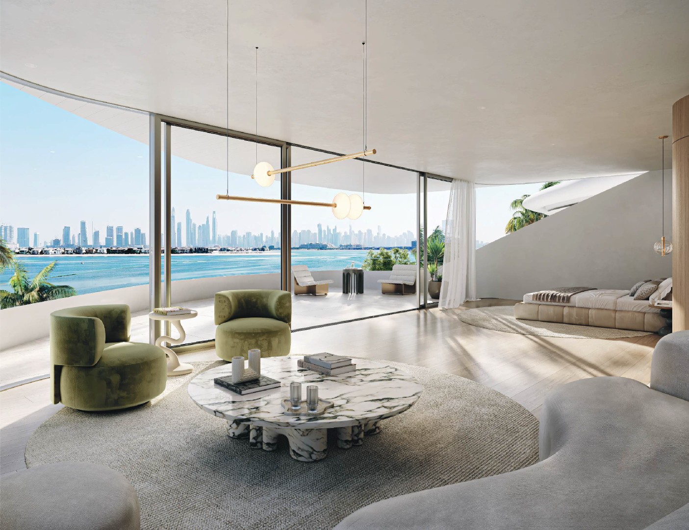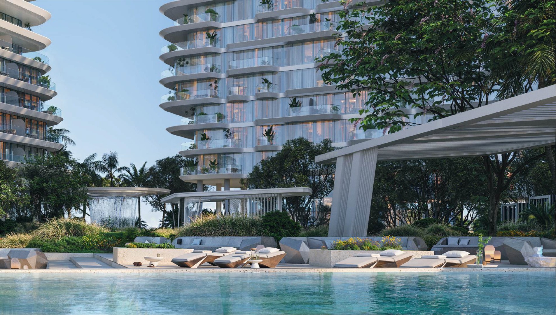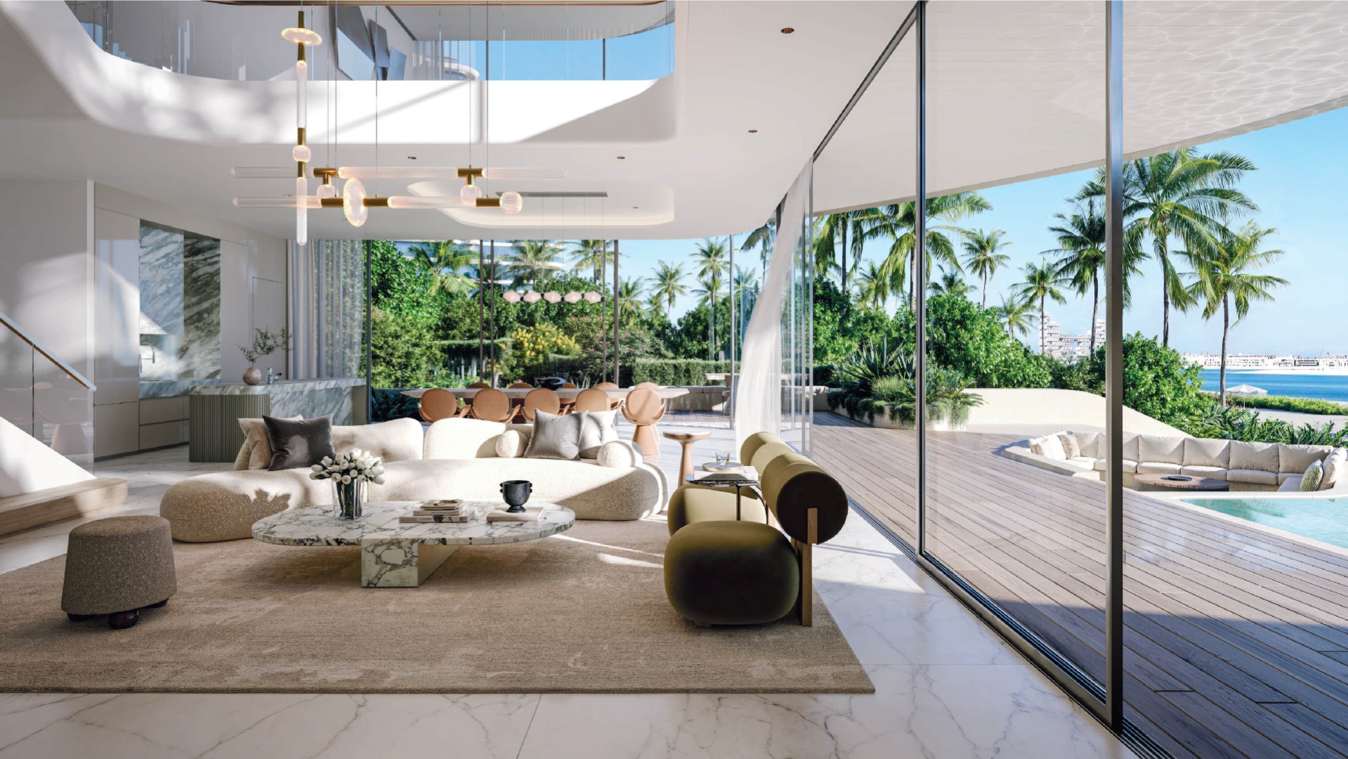 Designed to maximize light and views, the architecture features soft coastal colors and expansive glass, creating a seamless blend of indoor and outdoor spaces. Shaded walkways and lush landscaping enhance the environment. The homes offer spacious open living areas that extend onto large terraces, with elegant finishes and practical kitchens. Penthouse and beach mansion options provide larger terraces for entertaining.