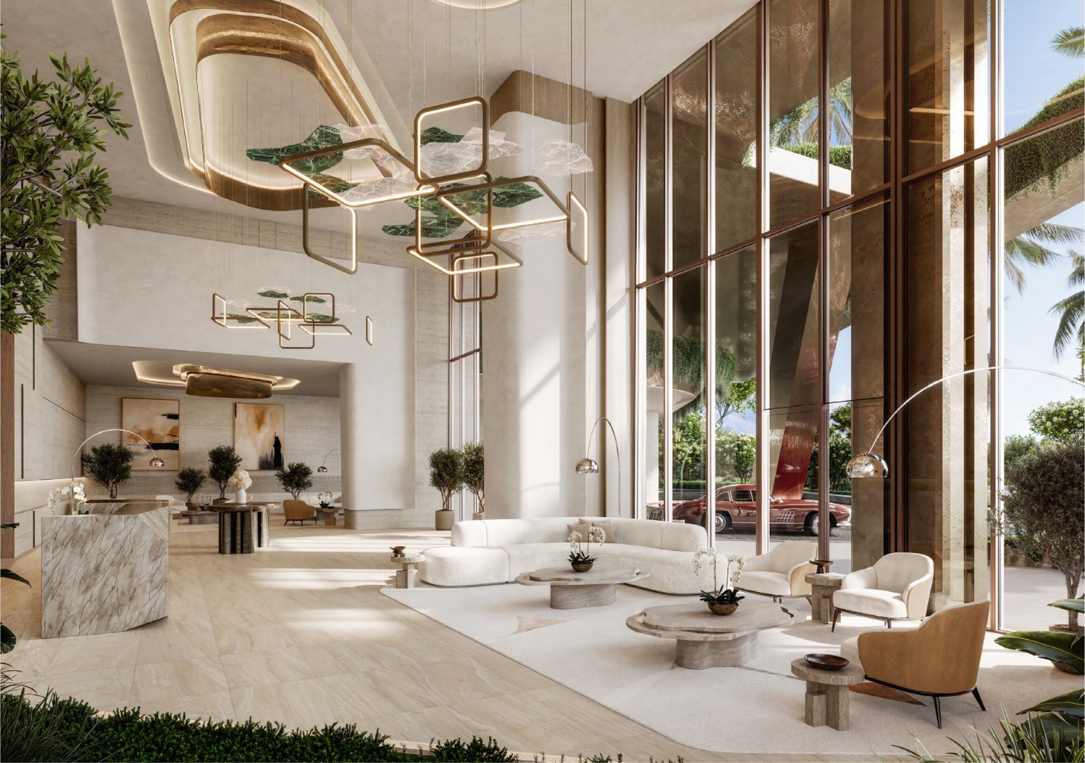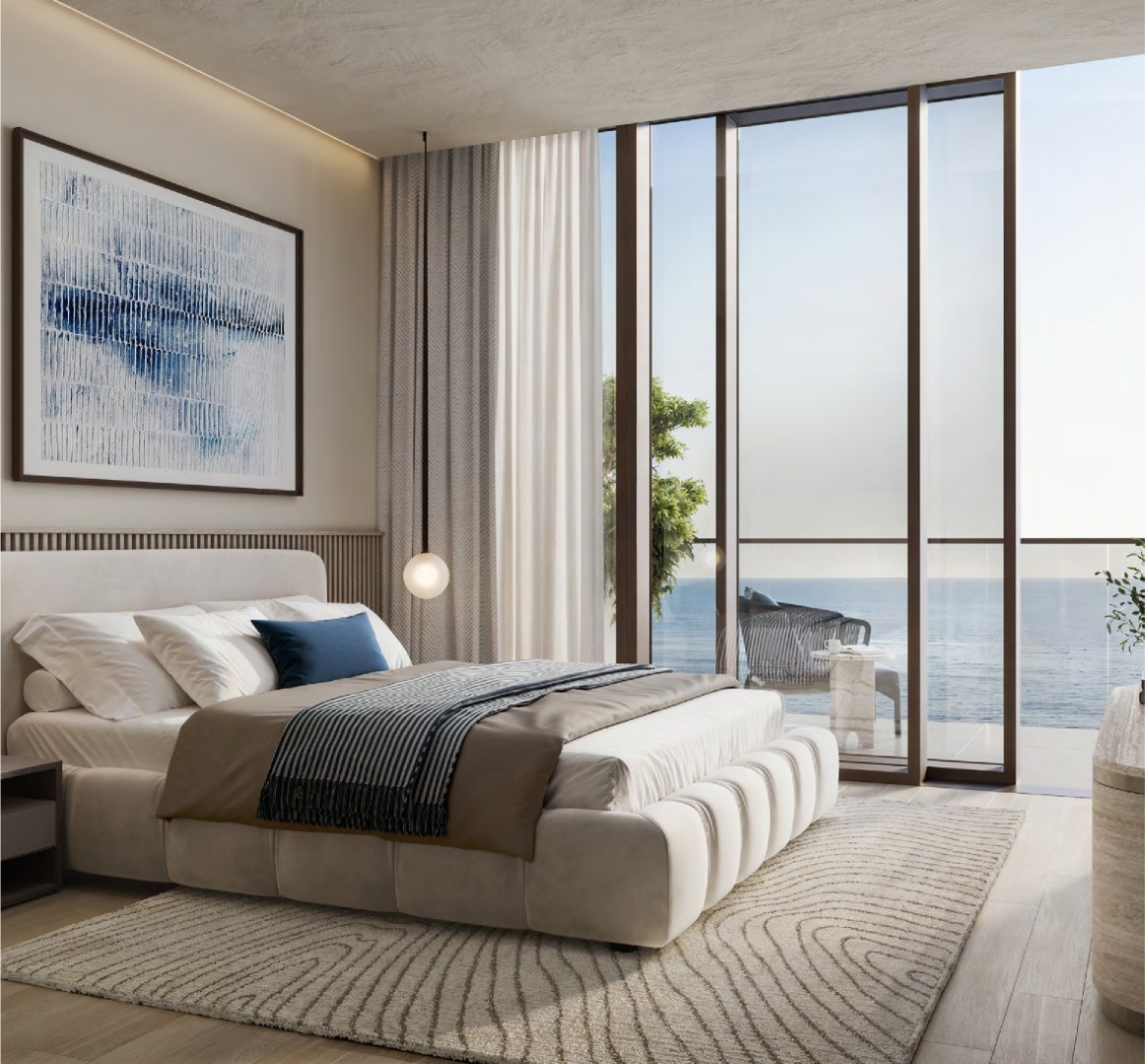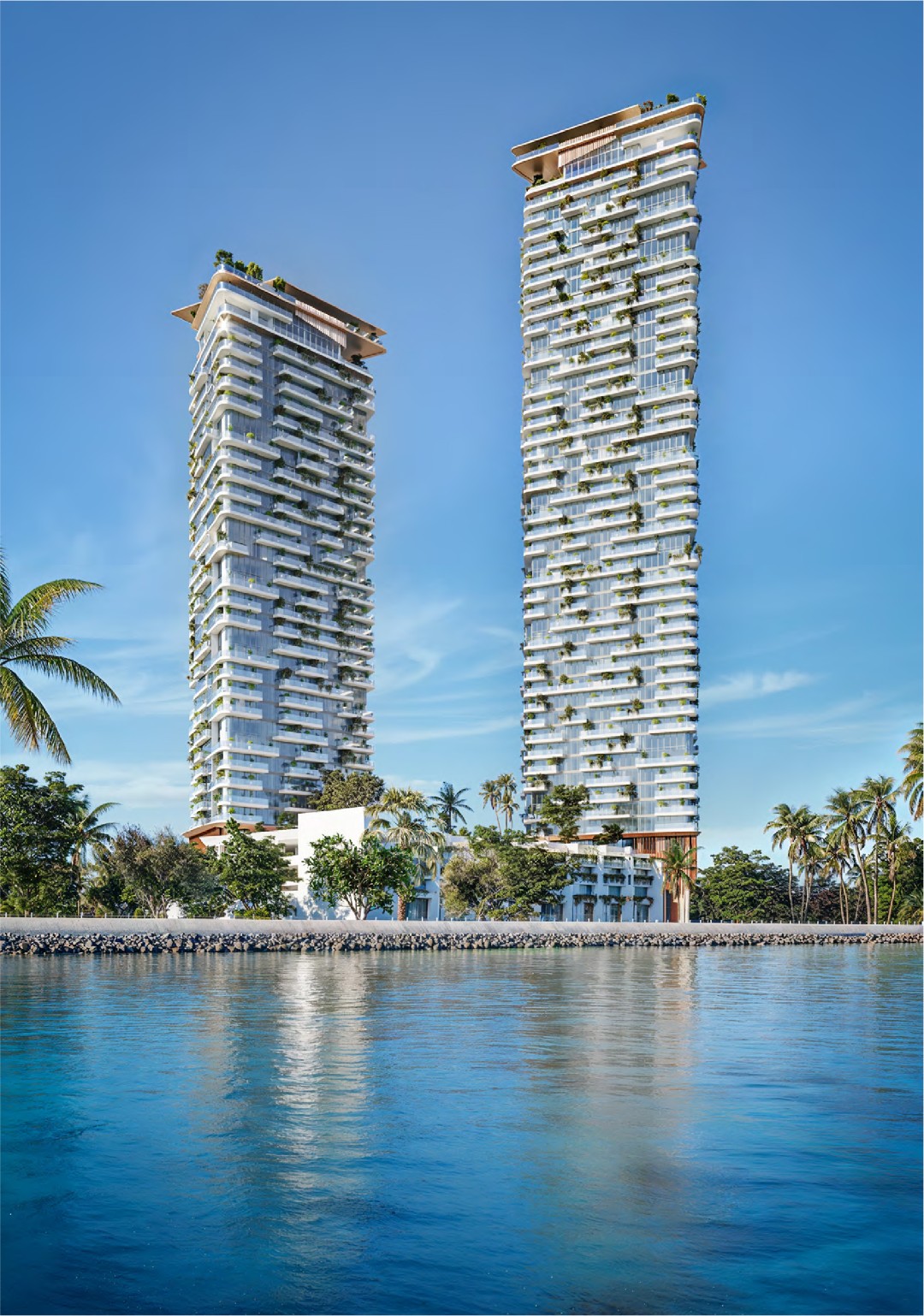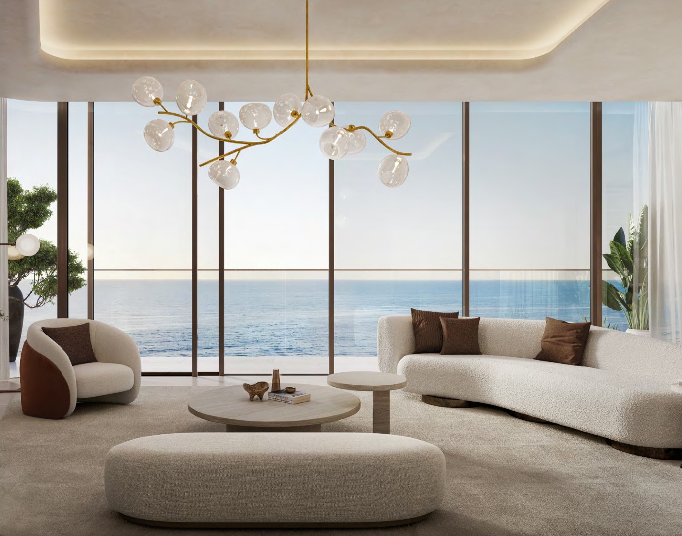 The contemporary coastal design showcases 44 and 31-story sail-inspired towers with glass and bronze accents, along with spacious, light-filled interiors. Homes include one to three-bedroom apartments, podium chalets, four-bedroom duplexes, and penthouses, all designed for privacy and style.