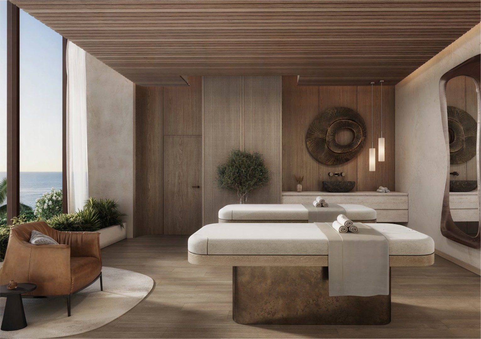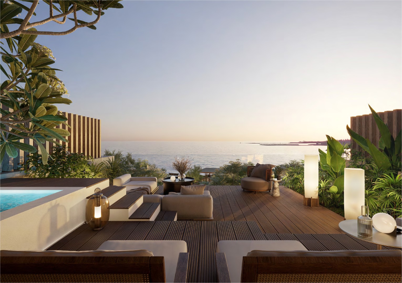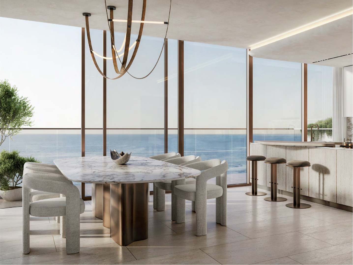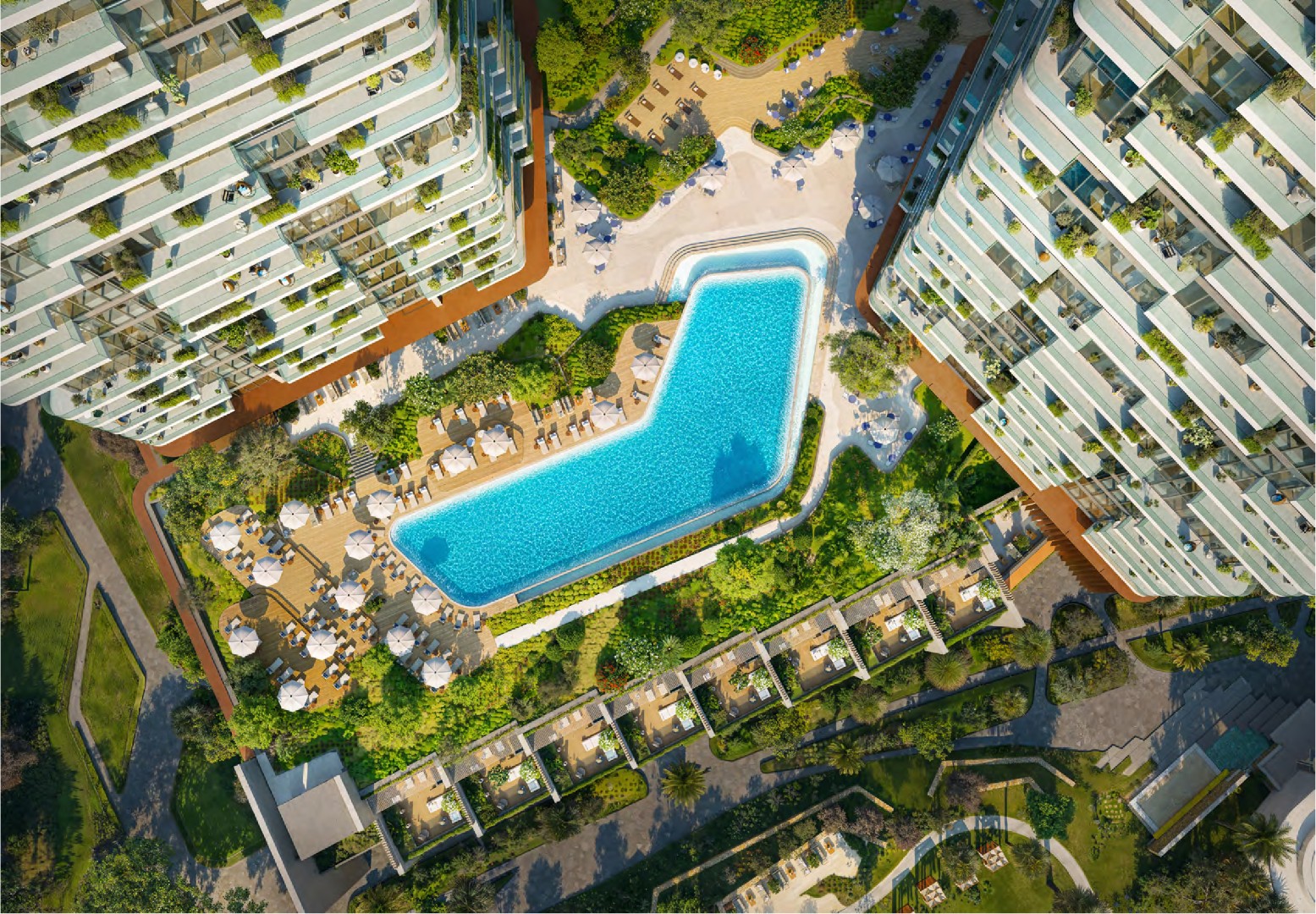 The contemporary coastal design showcases 44 and 31-story sail-inspired towers with glass and bronze accents, along with spacious, light-filled interiors. Homes include one to three-bedroom apartments, podium chalets, four-bedroom duplexes, and penthouses, all designed for privacy and style.