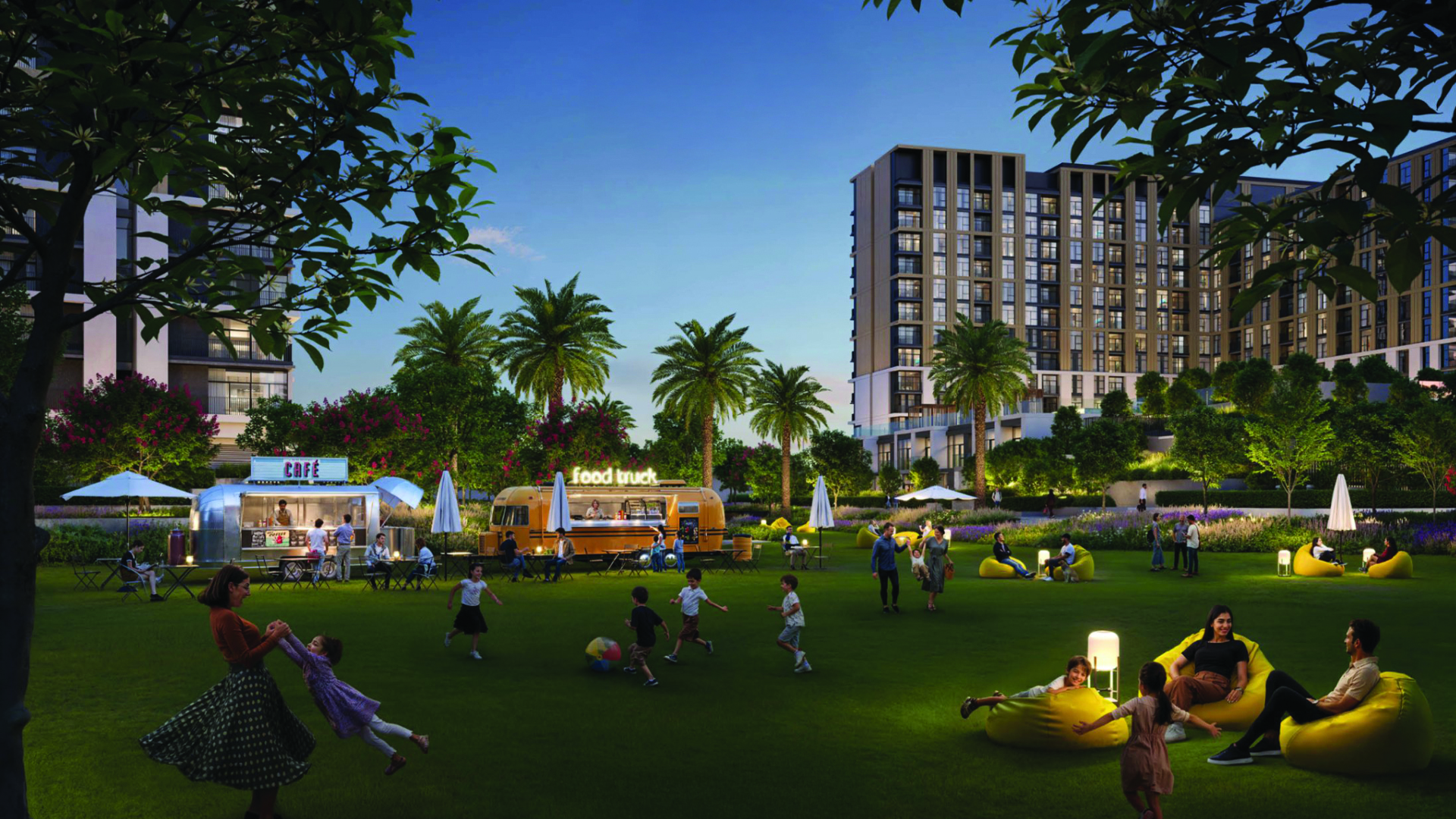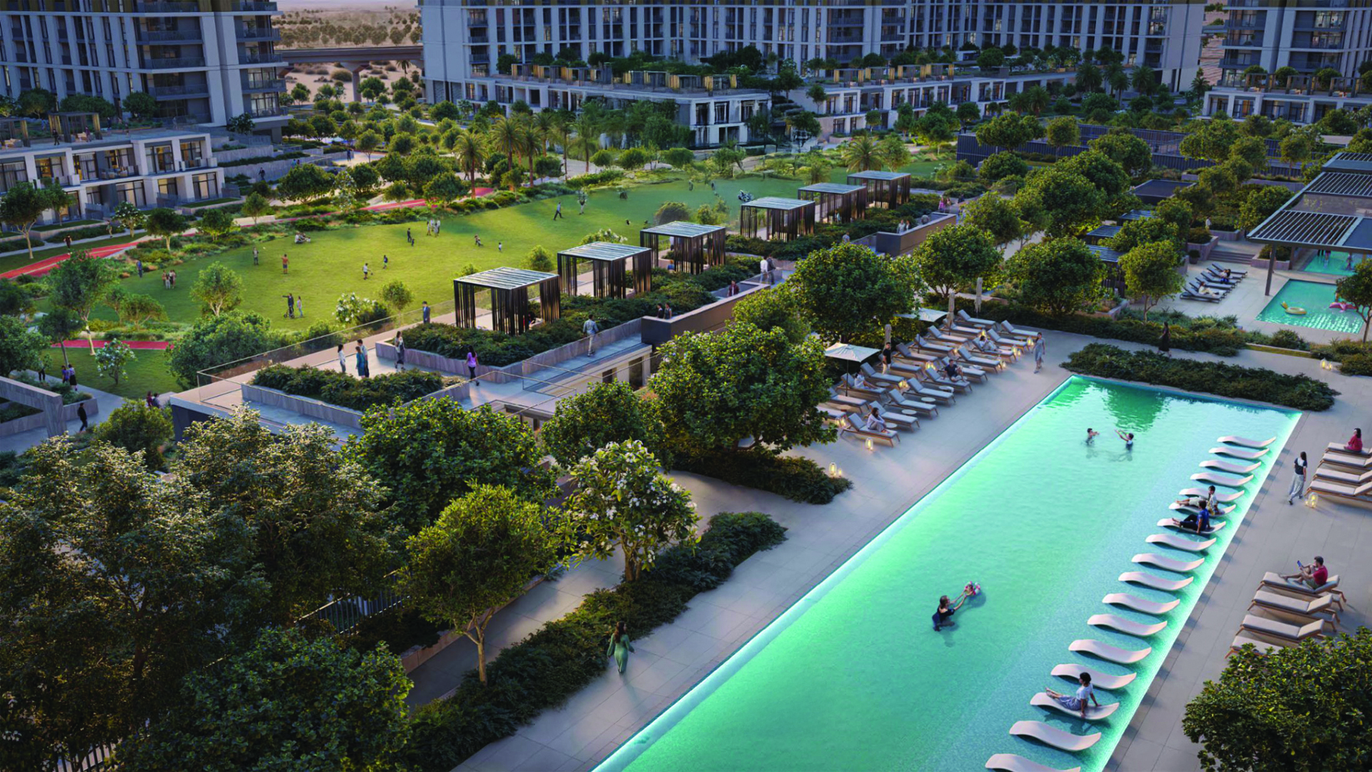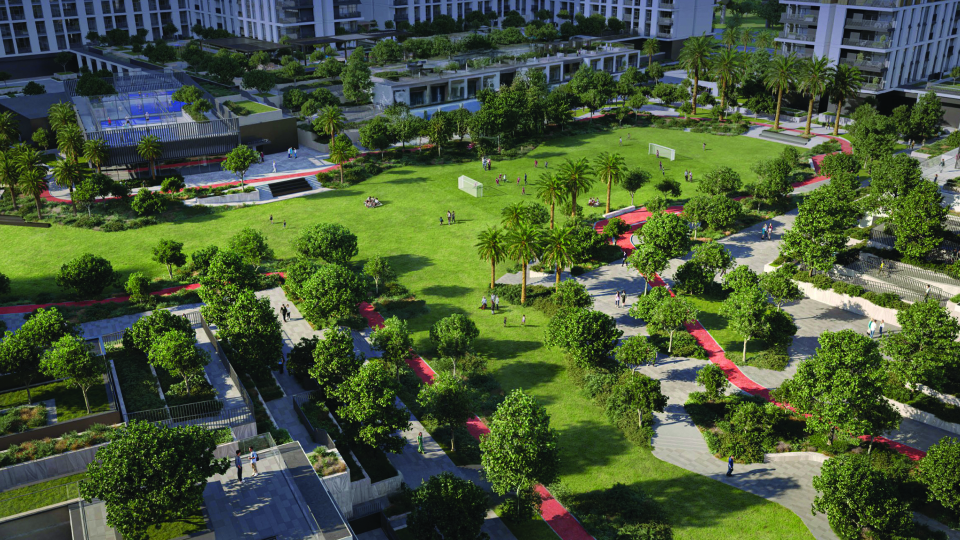 Green spaces thread through the master plan: serene gardens, tranquil ponds and a central park style promenade provide places to recharge. Social and wellness oriented amenities from a pavilion and BBQ courtyard to a living terrace, outdoor cinema and kids’ zones encourage connection. There are pools, private cabanas, meditation and yoga gardens, jogging and cycling tracks, outdoor gyms and a rooftop padel court.