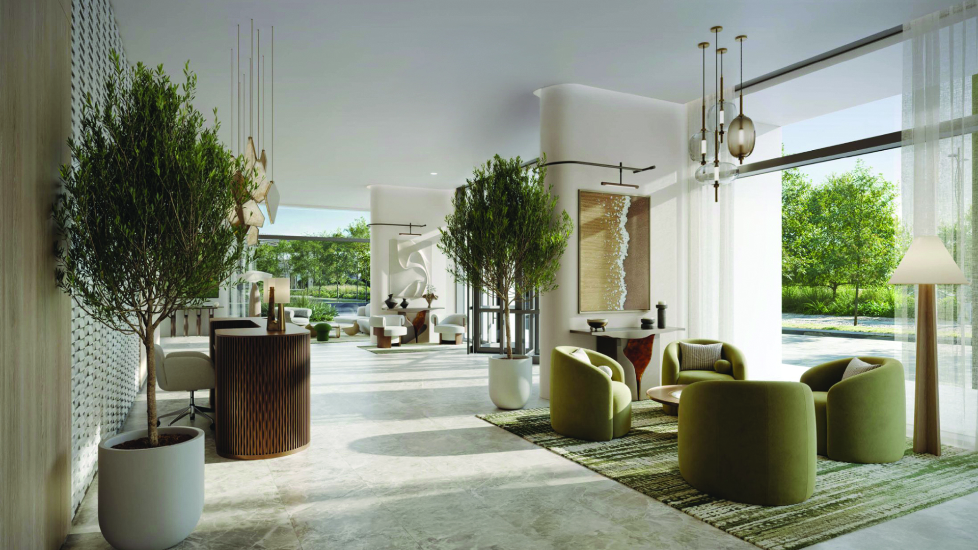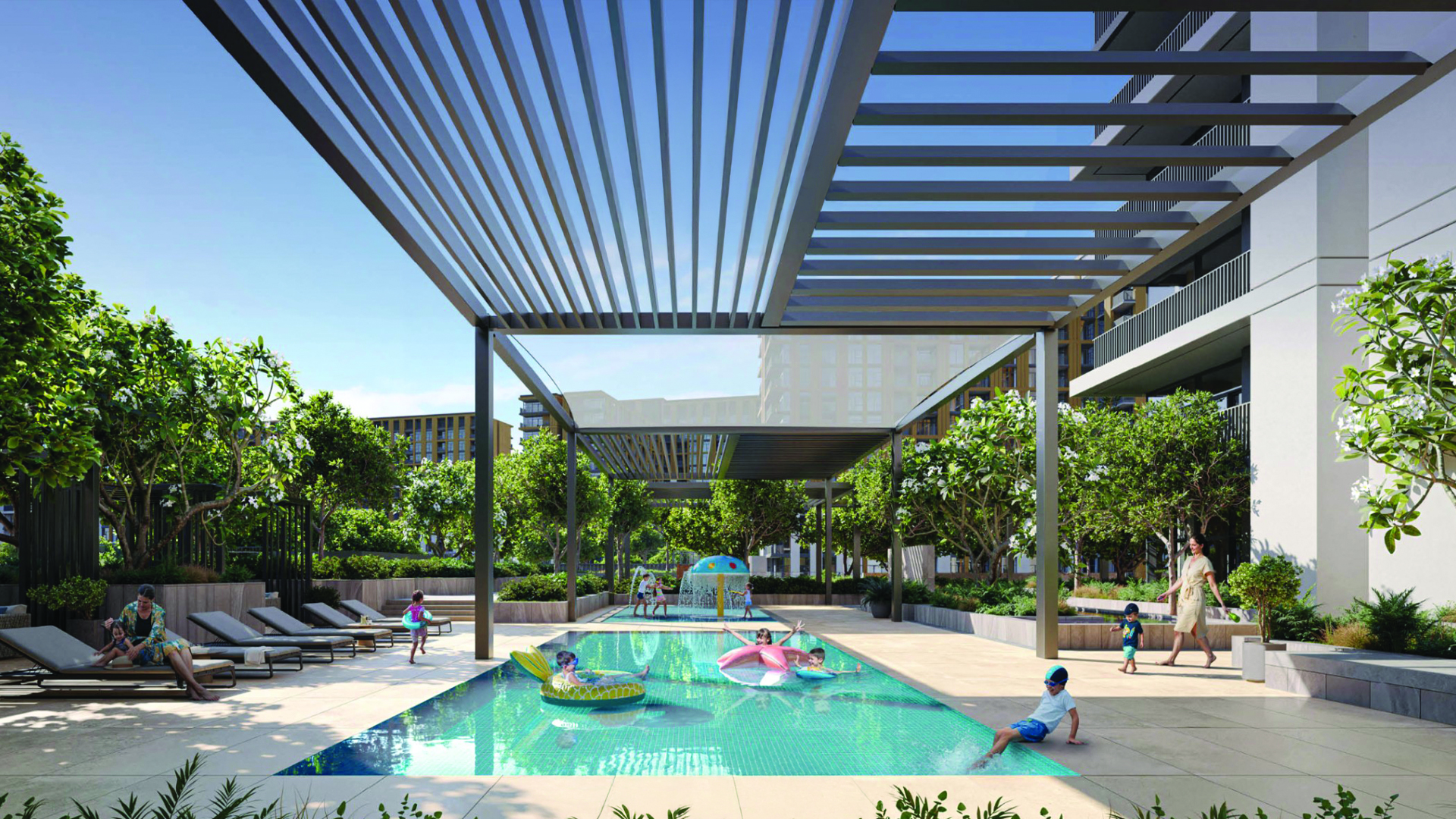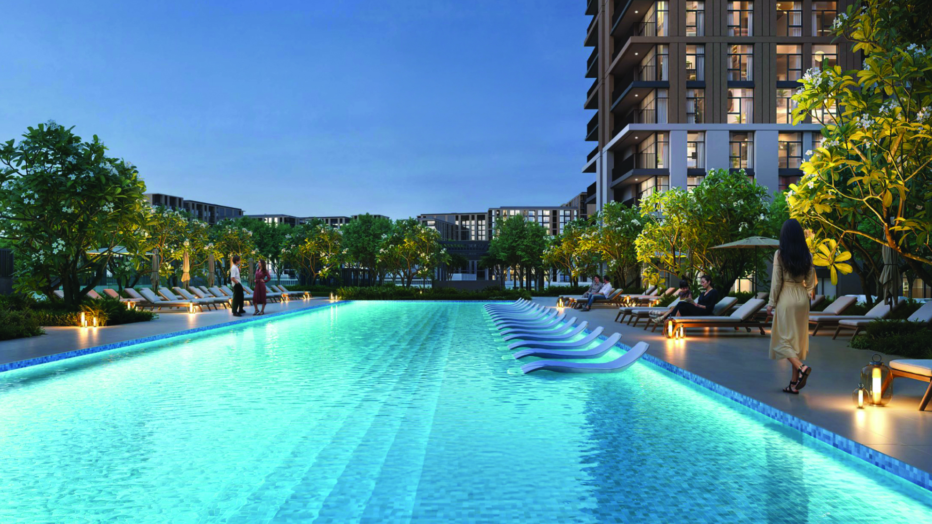 Green spaces thread through the master plan: serene gardens, tranquil ponds and a central park style promenade provide places to recharge. Social and wellness oriented amenities from a pavilion and BBQ courtyard to a living terrace, outdoor cinema and kids’ zones encourage connection. There are pools, private cabanas, meditation and yoga gardens, jogging and cycling tracks, outdoor gyms and a rooftop padel court.