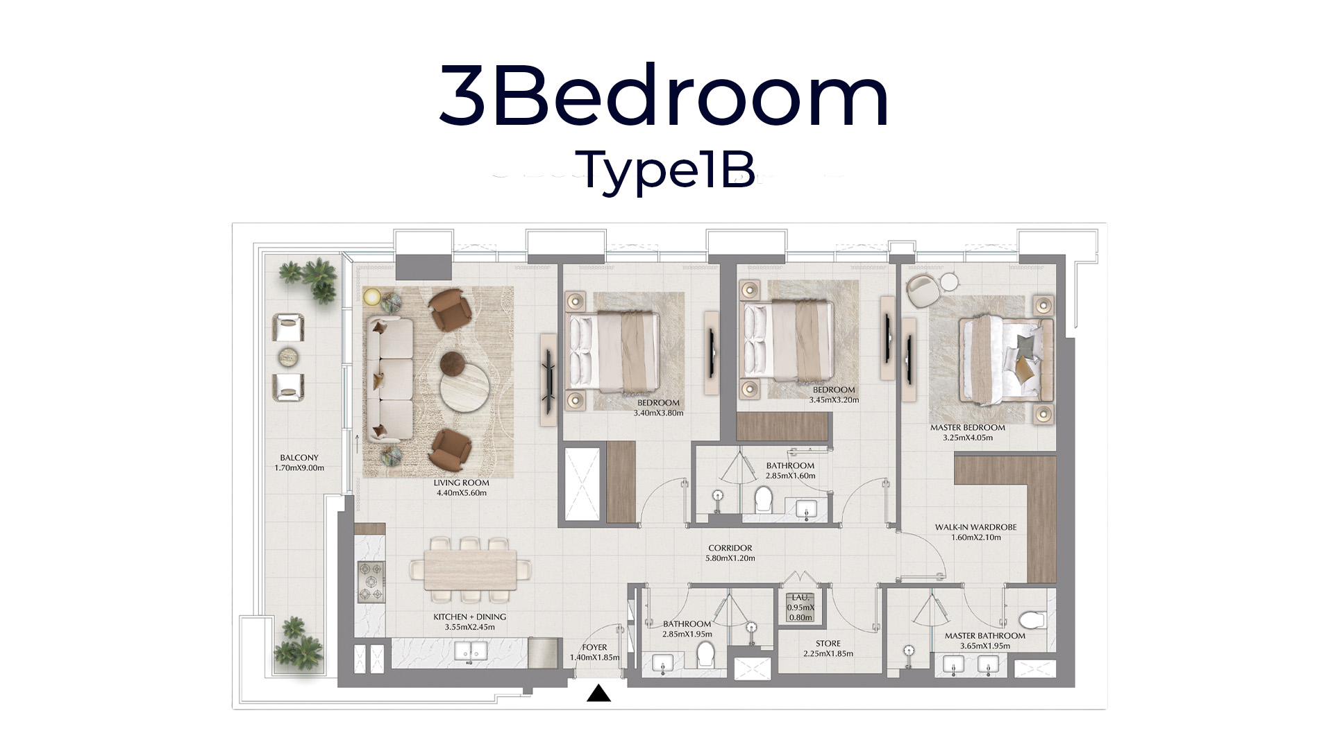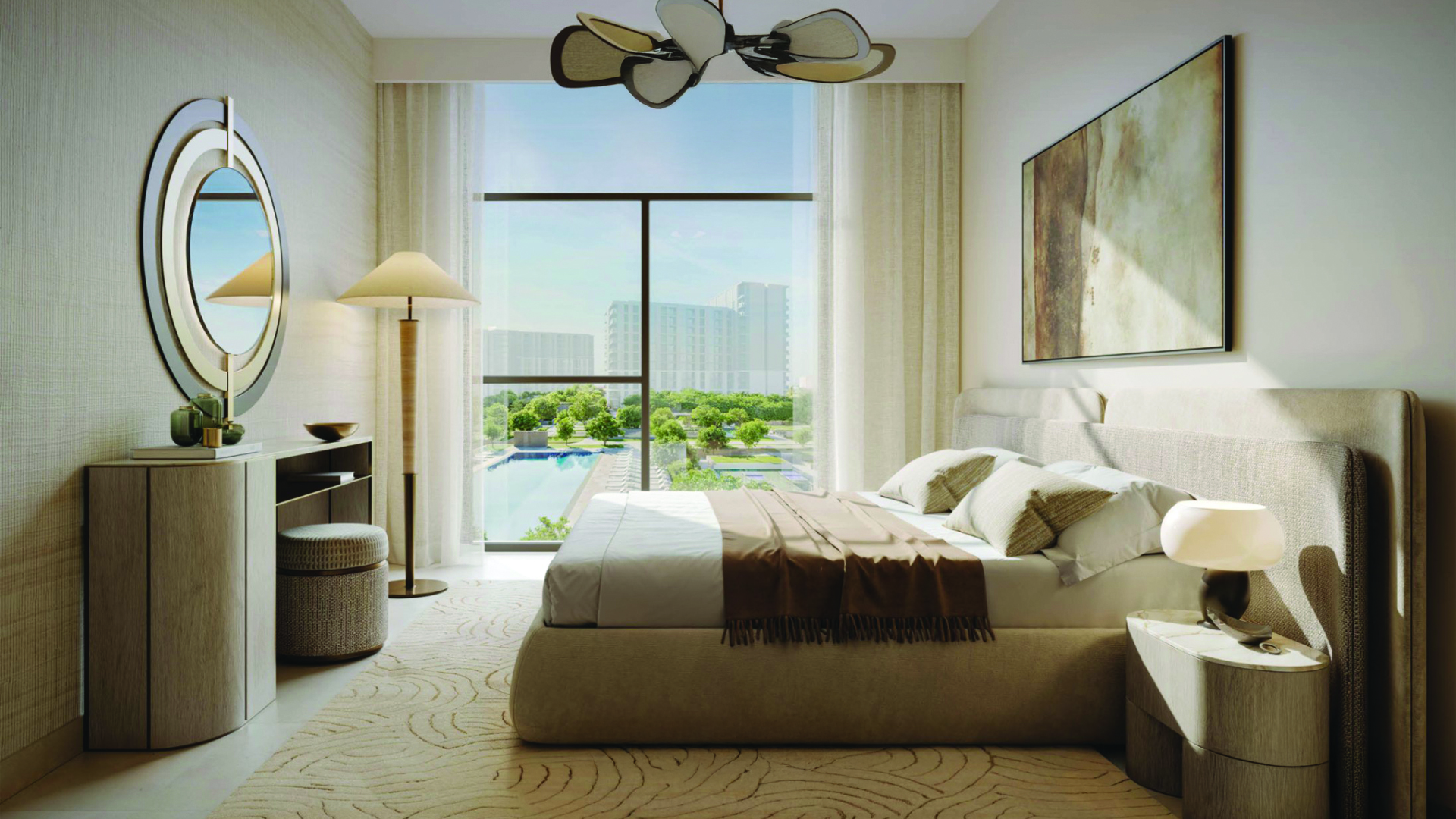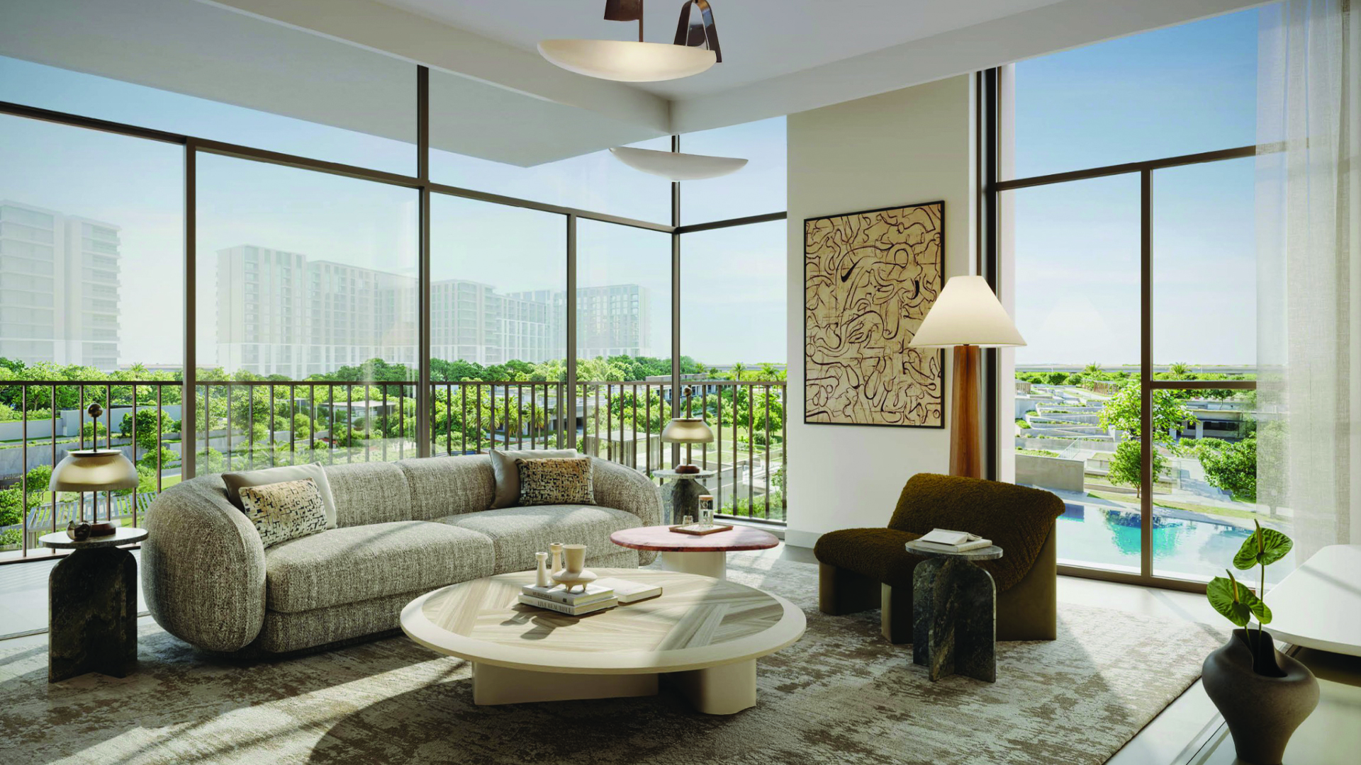 Inside, homes range from one‑ to three‑bedroom apartments and three‑bedroom townhouses. The flowing layouts are warm and contemporary, combining soft beige tones, wood veneer joinery, engineered stone surfaces and tinted glass. Unit sizes span roughly 742 – 866 sq ft for one‑bedrooms, 1,111 – 1,233 sq ft for two‑bedrooms and around 1,665 – 1,676 sq ft for three‑bedrooms. Three‑bedroom townhouses offer around 2,580 – 2,702 sq ft. Starting prices begin near AED 1.55 million for a one‑bed and reach about AED 4.88 million for townhouses.