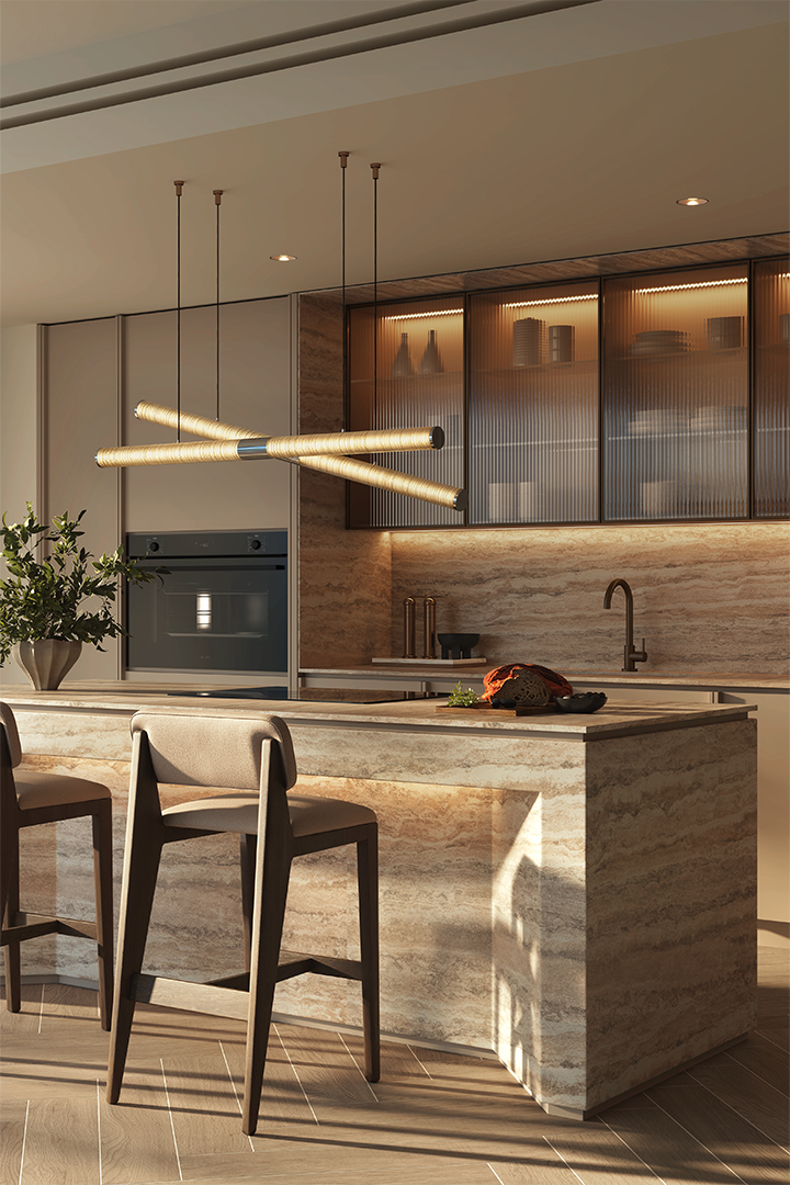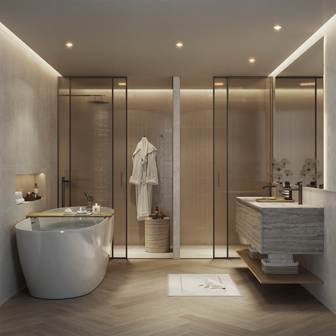 The apartments, ranging from one to three bedrooms, offer optional study and maid’s rooms. They are thoughtfully designed to maximize natural light and smart storage, finished in serene, contemporary color palettes. Floor-to-ceiling windows frame picturesque island skies and the sparkling blue of Soul Beach, while climate-controlled connections facilitate effortless movement throughout the year.