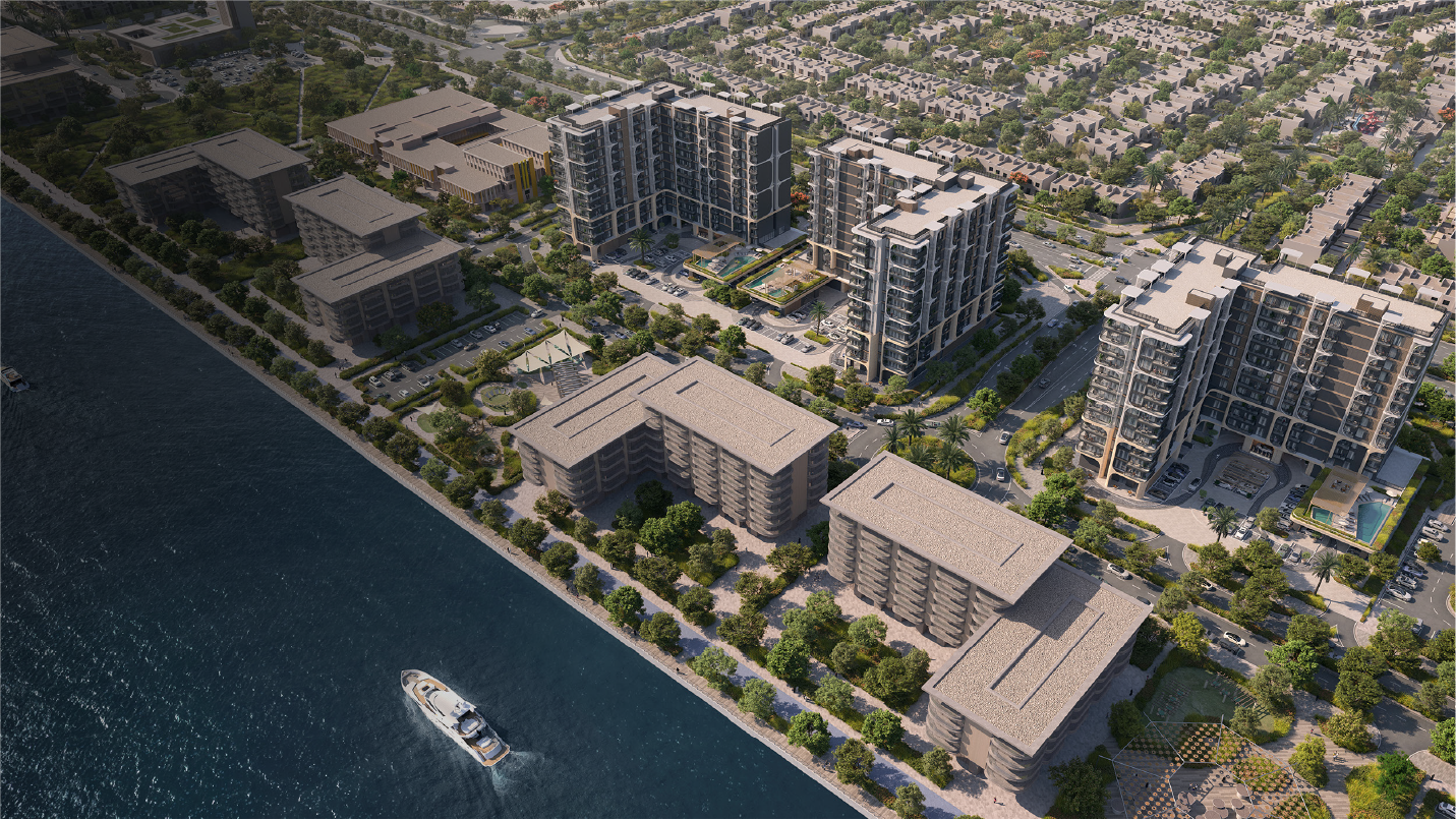 The modern architecture features canal-facing buildings and landscaped courtyards. Lively ground levels include lobby lounges and shared amenities, with controlled access for residents and guests, fostering a friendly atmosphere.
