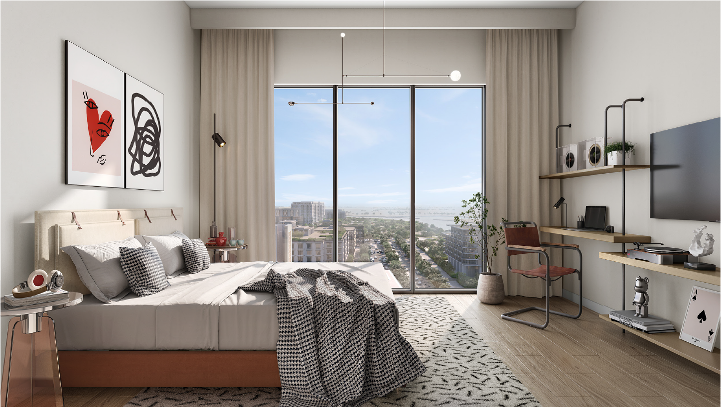 Inside, choose from studios and one- to three-bedroom layouts in light or dark finishes. Homes boast open living spaces, large windows, smart storage, and select private balconies. Building amenities include a lobby lounge, swimming and children’s pools, a gym, yoga spaces, a cinema room, a Games Den, an Imaginarium playroom, an outdoor play park, a Zen garden, bike racks, and parking. It’s a vibrant community for working out, relaxing, hosting friends, or enjoying sunset views over the canal.